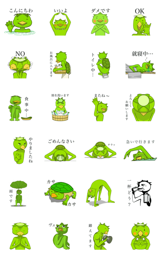 野河童の日常スタンプです 使えそうなものから使わなそうなものまで計24種類あります