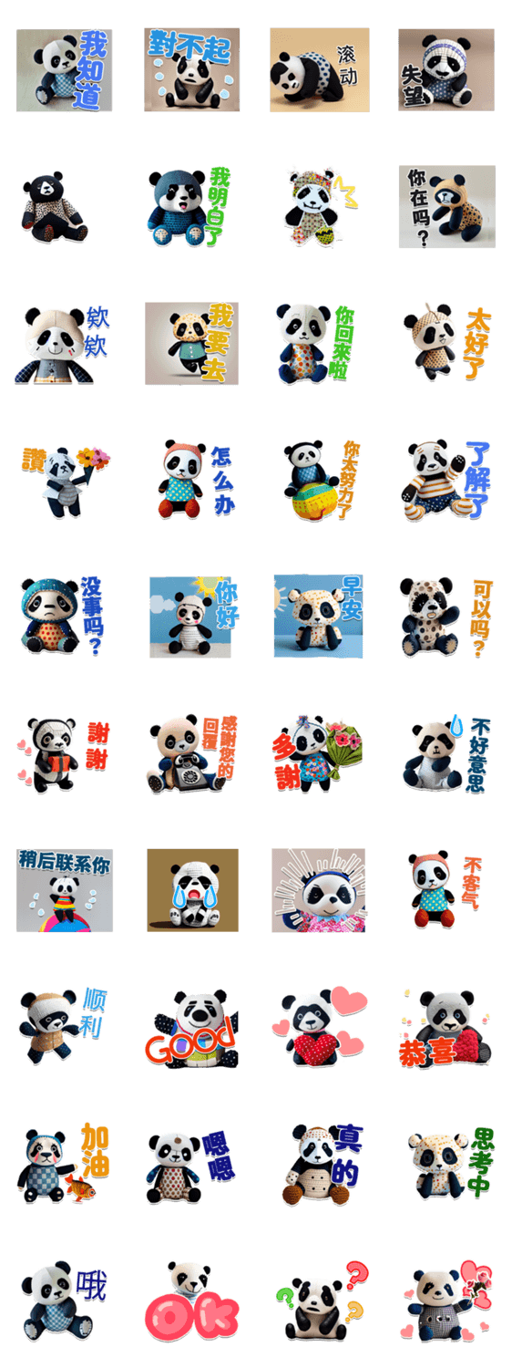 Panda/ Patchwork/ Handmade/ Everyday/ User-friendly / Easy to use/ Greetings/ Funny/ Handcrafted feel/ Entertaining / Popular/ Expressionless/ Serious