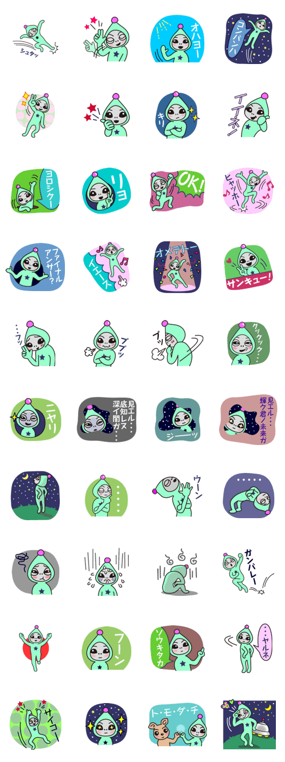 | スタンプ説明 | 宇宙人のアールグレイが色々な気持ちを表現します。ユルくてとぼけた宇宙人を、あなたのセンスで使いこなして下さい。 |