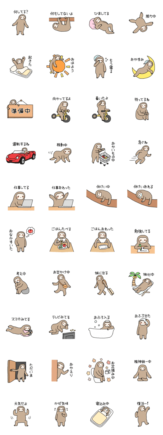 なまけものの、今何してるのかを表すスタンプです。何してる?などの日常生活での質問に答えやすいと思います。ナマケモノ/日常/使いやすい/シンプル/ゆるい/行動/