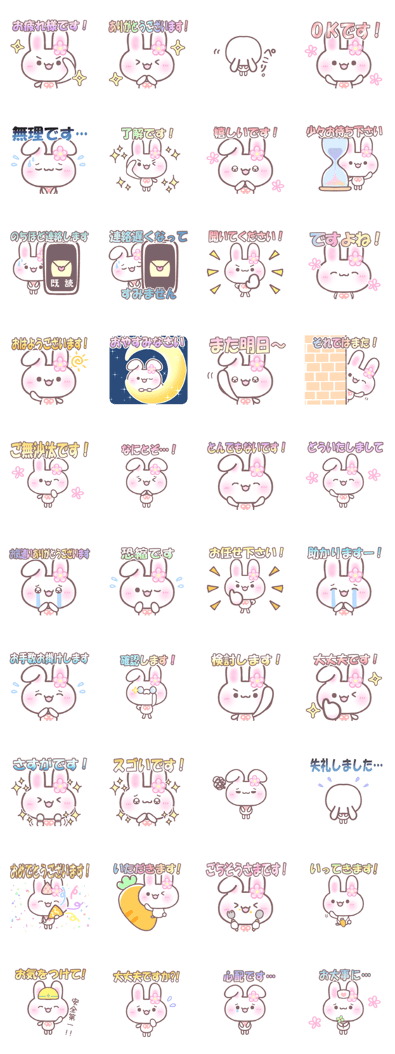 白うさぎ「うさぴょん」シリーズ第2弾!毎日使える敬語スタンプが登場です!挨拶や返事などがセットになった、あると便利なスタンプです♪