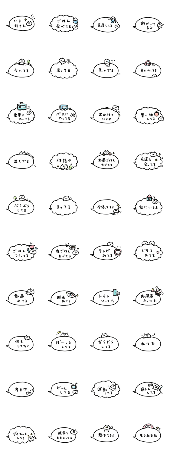 相手に伝える便利な日常で使えるねこねこゆーるのスタンプです。 ゆるい/シンプル/かわいい/猫/吹き出し/文字付き/何してる?/