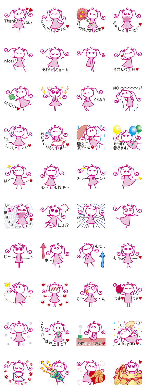 | スタンプ説明 | ピンクの女の子の第2段です。「シンプルに返事をしたい時」もしくは「とりあえずお返事」の時にご利用ください。 |