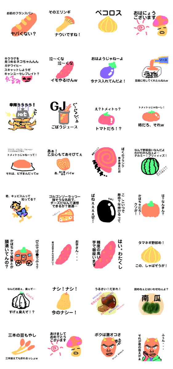 ボクのシュールなお野菜たちを愛して下さる全てのオーディエンスへ!パンとか猫とか、当初のコンセプトからブレブレのスタンプを召し上がれ〜。