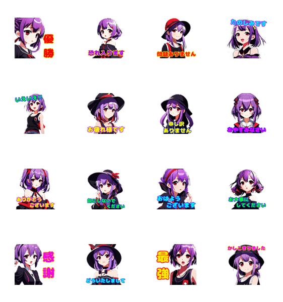 紫髪赤目系女子『アロエちゃん』の敬語をたくさん詰め合わせたきっと社会で役立つであろうスタンプです。