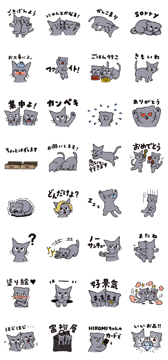 | スタンプ説明 | 愛嬌たっぷりでツンデレなスコティッシュフォールドのGURIと、ロシアンブルーの気分屋なTAOの愉快な日常。 |