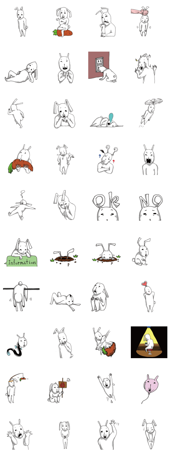 ゆるくてだるい、やる気のないウサギのスタンプです。ひとクセある表情をお楽しみください。