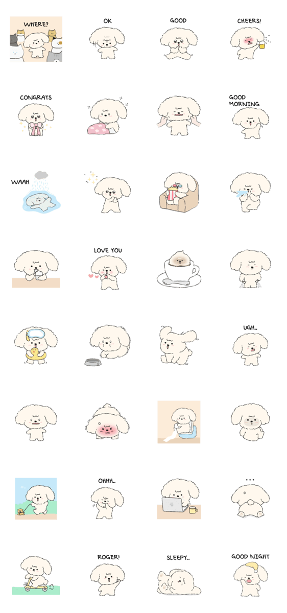 バニラクリーム色のかわいい子犬で、日常生活で使える感情をスケッチ風に表現しようと努力しました。