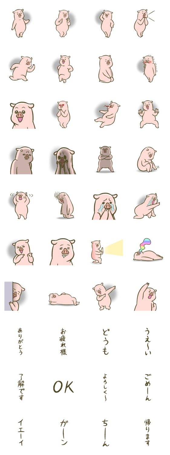 「ぶたの世界。」のアレンジ機能、組み合わせで使いやすいスタンプです。もちろんそのまま使ってもOK。ちょっとシュールな豚。手描き風ブタの世界をお楽しみください。