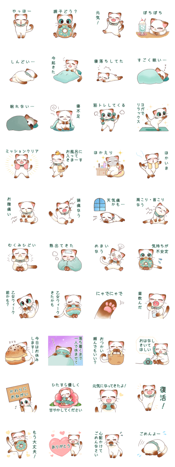 PMSや体調が悪い時、伝えづらいなぁトゲトゲするなぁと感じることはありませんか?このスタンプでは、トンキニーズの子猫ちゃんがあなたの代わりに気持ちをお伝えします。