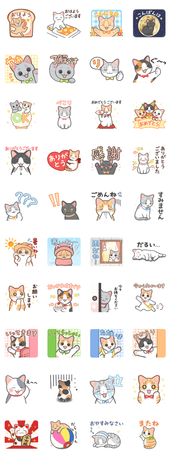 いろんな柄のネコちゃんが集まった日常会話で使えるスタンプです。