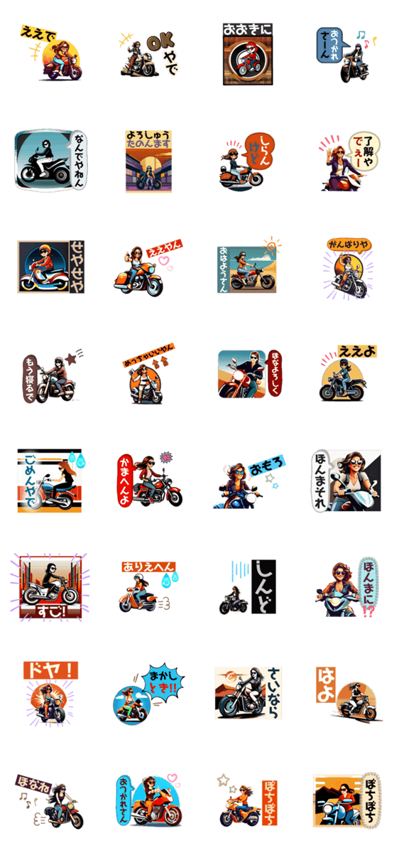 関西弁を使うバイク女子のLINEスタンプ。元気いっぱいの彼女たちが、日常会話を楽しく彩ります。バイク好きや関西弁ファンにぴったり!