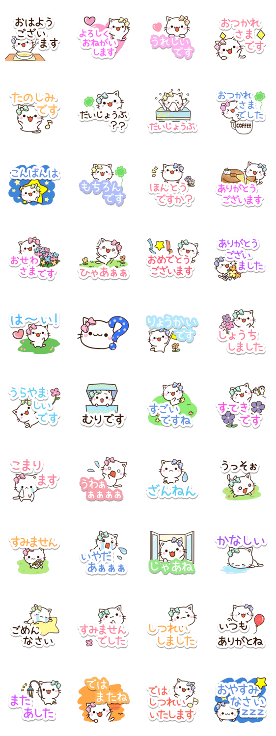 リボンをつけた白猫の『ちびシロ』。花や明るい文字のねこスタンプ。白ネコ好きの方にぜひ【かたこ】あいさつ・可愛い・しろねこ・カオマニー・ペルシャ・チンチラ