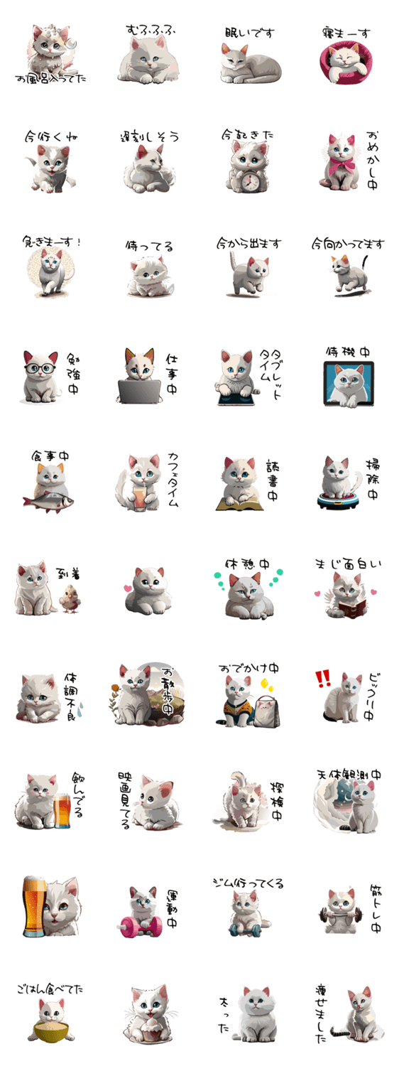 猫さんが近況を伝えてくれるスタンプです。自分の状況を簡単に説明できます。お友達や家族に気軽に近況をお届けください。