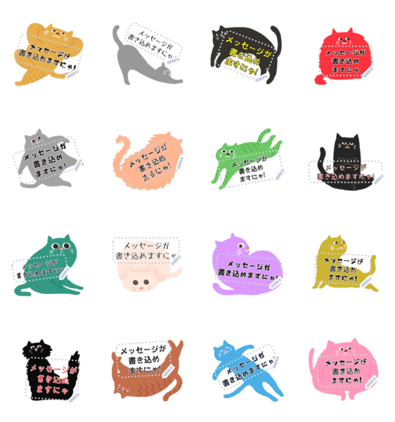 自由に文章が書き込めるフレームですにゃ♪ゆるっと可愛いカラフルなネコ♥黒猫や縞猫・白猫に長毛猫・ぽっちゃりまん丸にゃんこ★「どうぶつメッセージスタンプ」特集♥ 現在この商品は一部のスマートフォン版LINE 10.3.0以上のトークルームでのみ使用できます。動作環境の最新情報はヘルプをご確認ください。