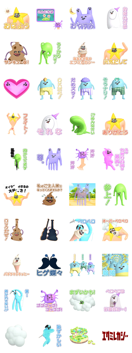 | スタンプ説明 | 声優・江口拓也画伯の衝動が生んだ味がありすぎるキャラクターたち。「貝社員」など手掛けたモリ・マサ監督によるアニメ「エグミレガシー」のキャラクタースタンプが登場! |