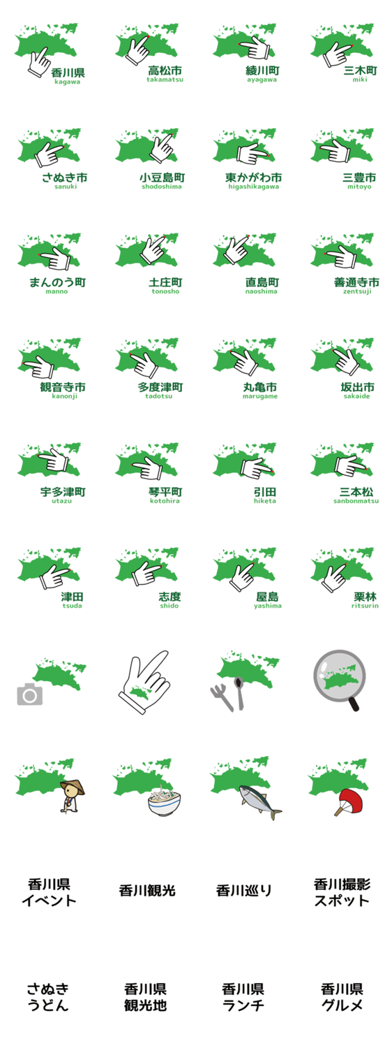 今どこにいるかをお知らせ。県市町村名で香川県をより便利に旅行・暮らすためのラインスタンプ。イベント、待ち合わせに。位置ゲームなどゲーマーに。組み合わせて使えます