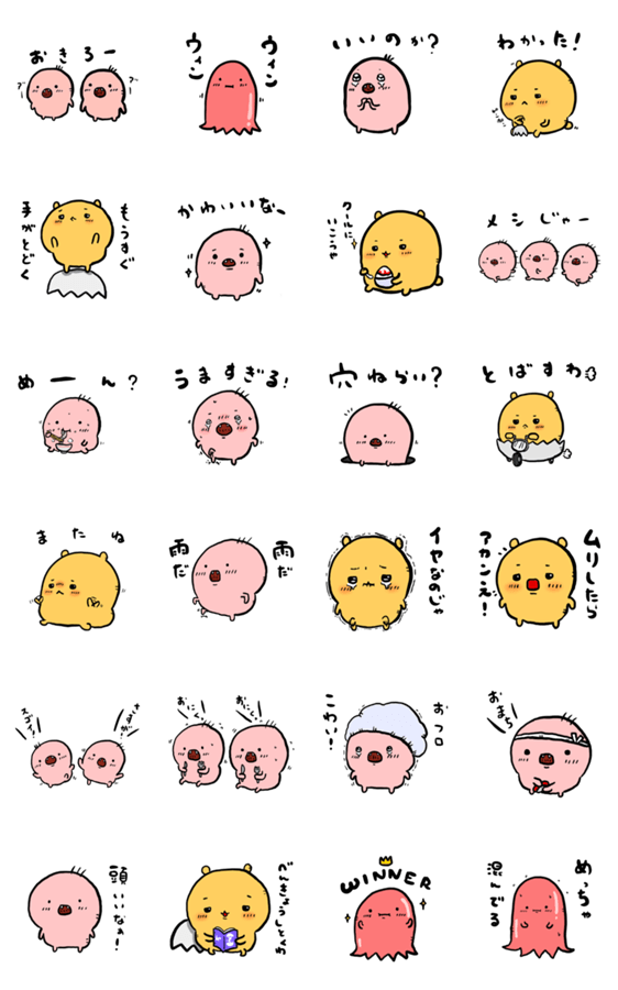 まめぐみの仲間たちです。 いつも楽しく過ごしています。 卵の子は「Kimmy(キミー)」 小豆色の子は「Daizu(ダイズ)」 ウインナーの子は「WIN(ウイン)」です。