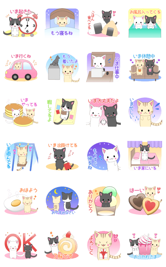 小さいにゃんこたちのスタンプ第10弾。とら猫/トラ猫/茶トラ/はちわれ/ハチワレ/白猫/黒猫/カワイイ/可愛い/ネコ/もふもふ/モフモフ/挨拶/日常会話/気持ち/感情/今/現在