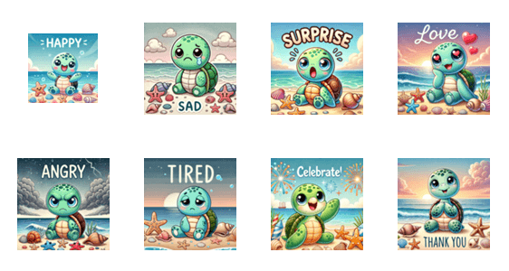 かわいいウミガメがあなたの感情を表現します!喜び、悲しみ、驚き、愛情、怒り、疲れ、お祝い、感謝の8つの感情を楽しんでください。