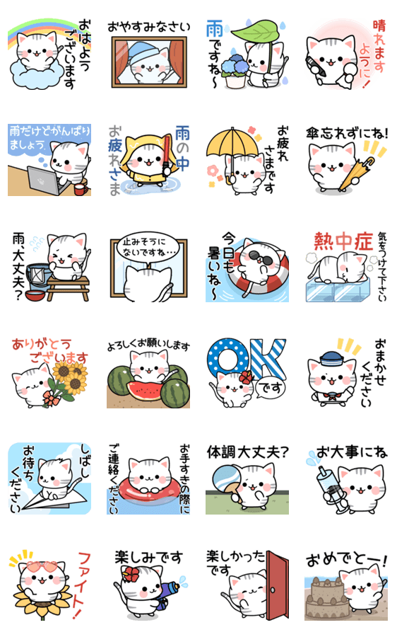 アメリカンショートヘア―のアメちゃんの、梅雨から夏に使える便利なスタンプです♪よく使う気づかいのメッセージもたくさん♥