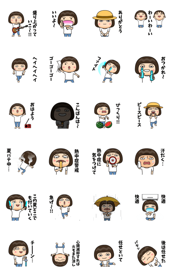 芋ジャージ女子が正装である芋ジャージを脱ぎ捨てTシャツにジーンズの涼しげな恰好に大変身!夏に使えるクールなスタンプ第3弾です♪