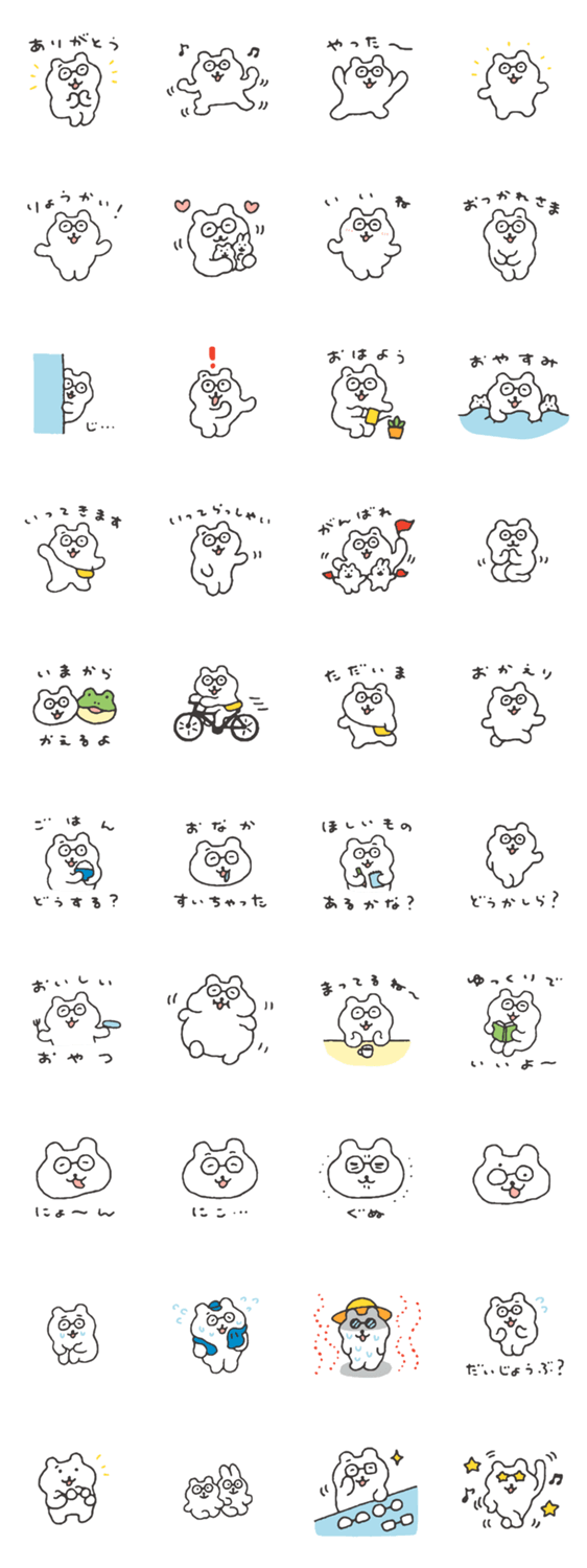 あなたもめがね わたしもめがね みんなでかけると たのしいね・・・ 家族への連絡や 日常会話に使える表現が多めの メガネをかけた すこやかなしろくまのスタンプです。
