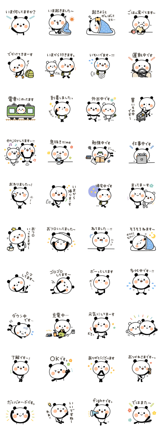 ちょこっと敬語のゆるパンダの、いま何してるか、どんな状況かなどを伝えるのに便利なスタンプです♪