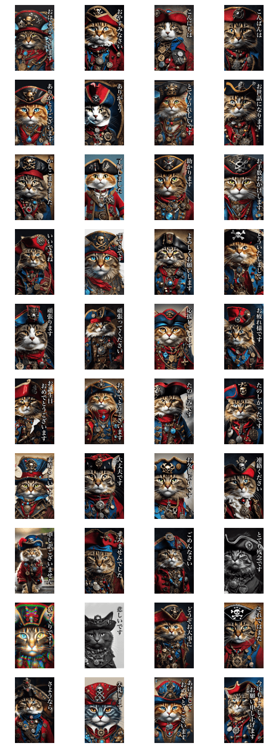 春夏秋冬年中使える/丁寧/敬語/挨拶/あいさつ/日常/おめでとう/お祝い/誕生日/正月/あけおめ/猫/ねこ/こねこ/ネコ/キャット/cat/海賊/人気/おすすめ/実写/画像生成/AI作画 ※このスタンプはトークルームで大きく表示されるBIGスタンプです。