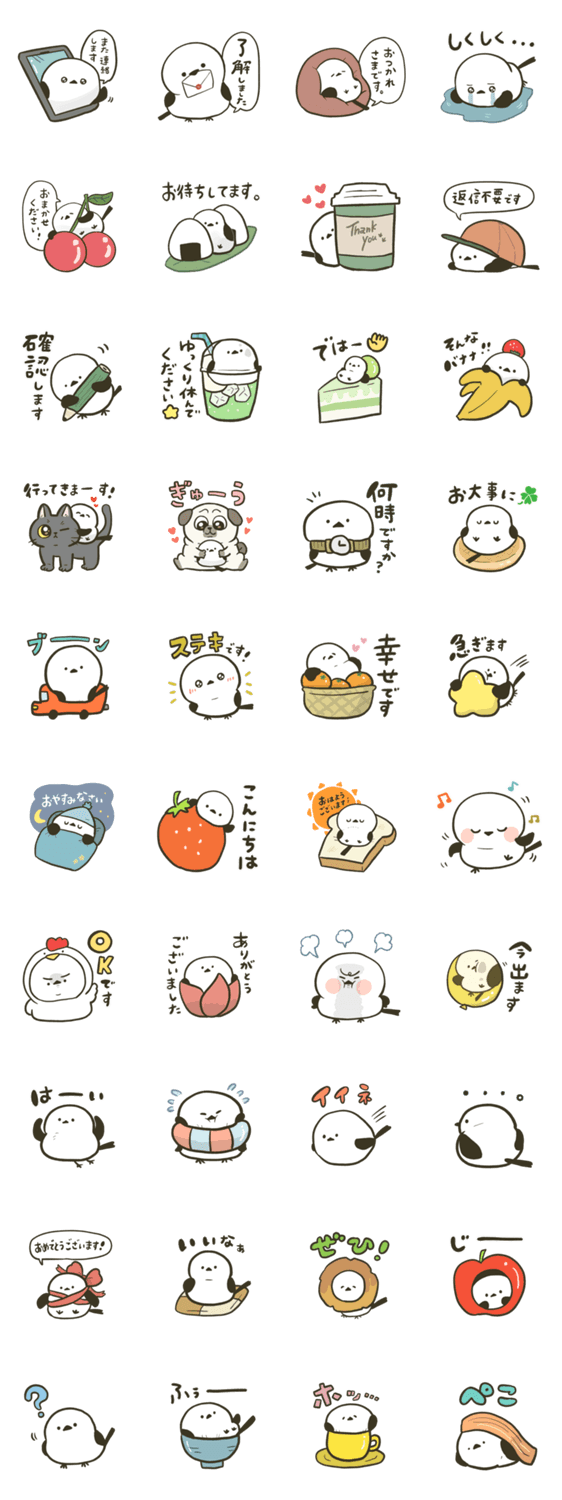 可愛い、ゆるい無気力シマエナガの基本の言葉スタンプです。敬語が多くて使いやすいよ◎食べ物系も!