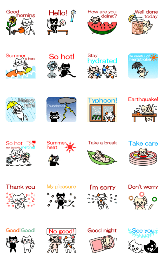 白猫たまと黒猫クロの、夏に便利なスタンプです。(猛暑、大雨、台風、雷、スイカ、アイス、風鈴、うちわ、日傘、プール)