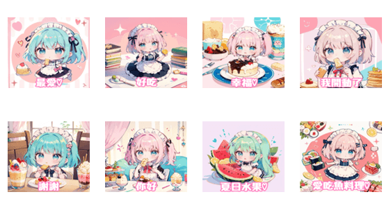 美味しそうな料理を持った可愛いメイドさんのスタンプ。日常会話にぴったり。