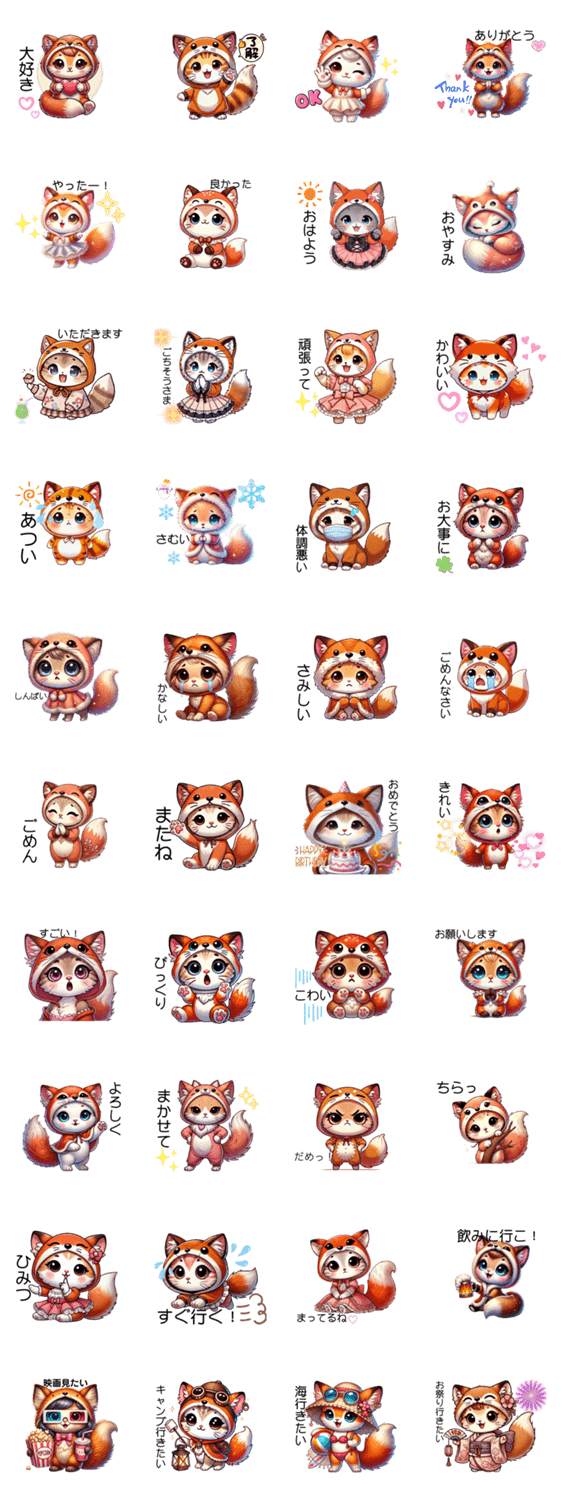 | スタンプ説明 | 色んなパターンの可愛い猫が、きつねの着ぐるみを着て登場するスタンプセットです。友達や家族へのメッセージに、ファンタジーな雰囲気をプラスしましょう。 |