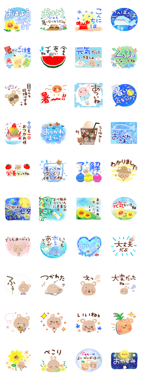 夏・暑い日に使える、気づかいの言葉を多く入れたスタンプセットです。 ~猛暑/暑中見舞い/海/スイカ/家族/挨拶~