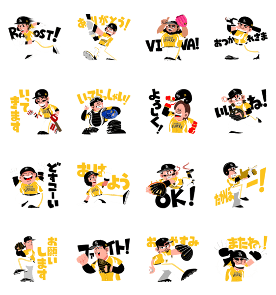 | スタンプ説明 | 福岡ソフトバンクホークス公式スタンプ。イラストレーター・りおたさんによる描き起こしイラストで、鷹祭 SUMMER BOOSTユニフォームに身を包んだ選手たちのスタンプです。 |