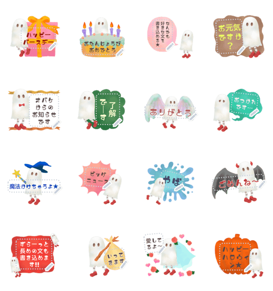 文を書き込めるメッセージスタンプ★ 絵本みたいな質感のおばけ(ゴースト)のフレーム♪ お誕生日のお祝いケーキ/ハロウィン/ウェディング/吹き出し/羽根/角/魔女っこなど 現在この商品は一部のスマートフォン版LINE 10.3.0以上のトークルームでのみ使用できます。動作環境の最新情報はヘルプをご確認ください。