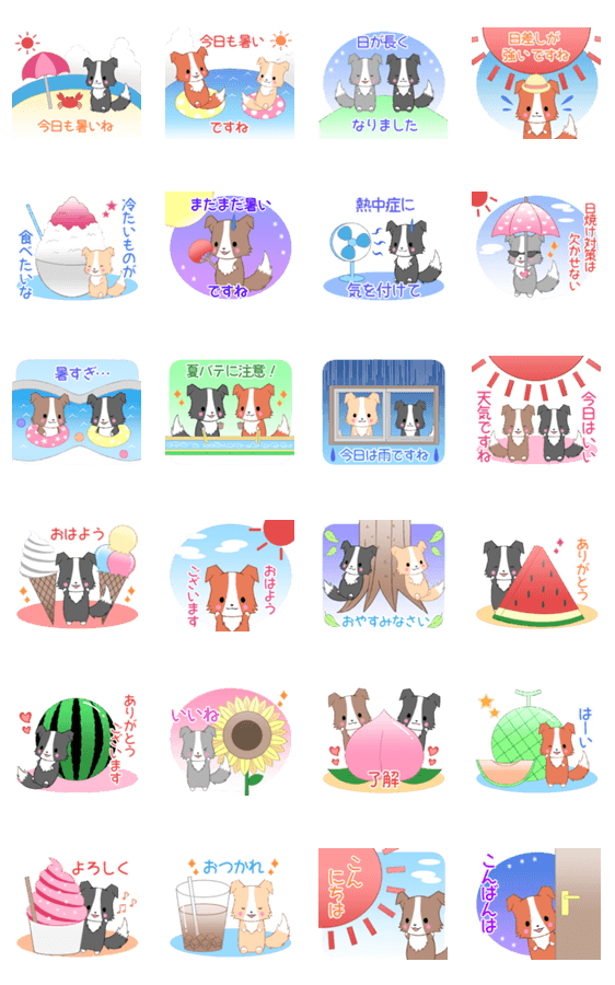 小さいボーダーコリーたちのスタンプ第15弾。ブラック/レッド/チョコ/ブルー/クリーム/かわいい/カワイイ/可愛い/犬/もふもふ/モフモフ/挨拶/日常会話/気持ち/感情/夏