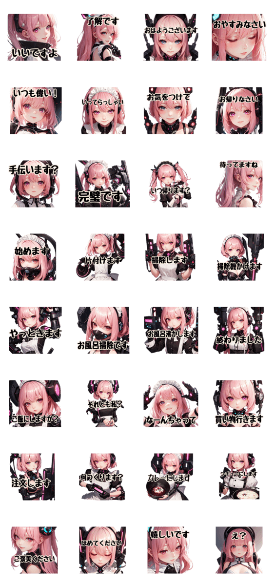 | スタンプ説明 | Please Mr.Maverickの物語に登場する、チップで性格が変わるアンドロイド。その家事モード・スタンプです。 |