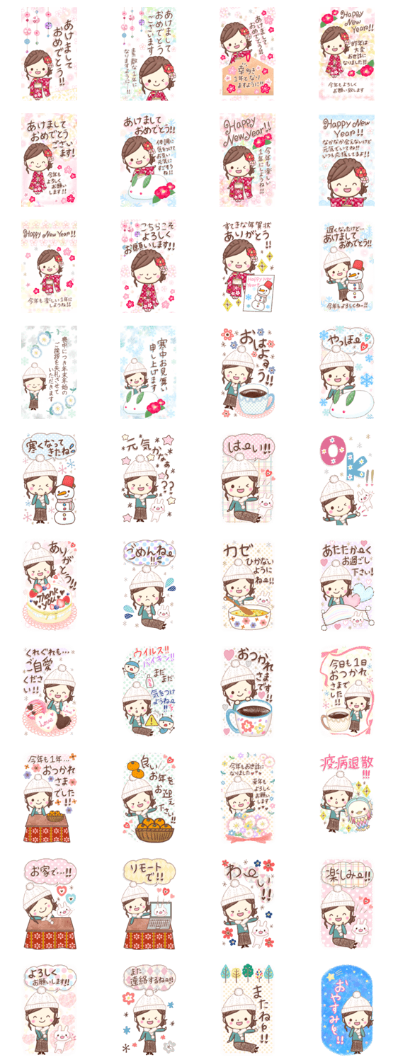 冬の挨拶や気遣い体調管理などの日常会話、年賀状喪中寒中お見舞いなどの年末年始、お正月、年越し含む内容です。 ※このスタンプはトークルームで大きく表示されるBIGスタンプです。