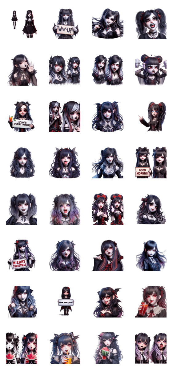| スタンプ説明 | "吸血鬼の女の子が吸いたい、吸血鬼の女の子、吸いたい、表現力豊か、ユーモラス、イラスト、LINEスタンプ、 |