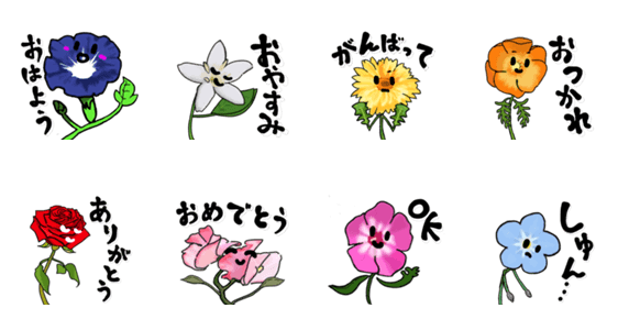 表情と仕草のついた色とりどりなお花のスタンプです。
