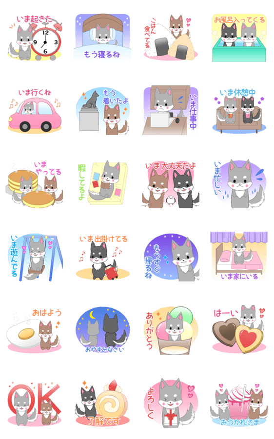 小さいハスキーたちのスタンプ第8弾。シルバー/ブラック/レッド/チョコ/カワイイ/可愛い/キュート/犬/イヌ/もふもふ/モフモフ/挨拶/日常会話/気持ち/感情/シンプル/今/現在
