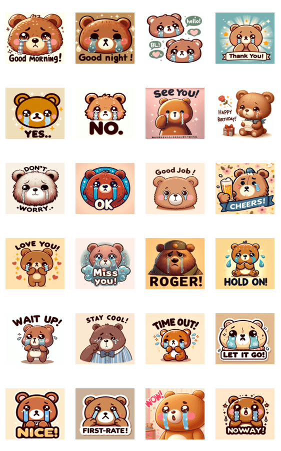 うるうるした目が魅力的なクマのスタンプセットです。日常会話に使いやすい可愛いクマたちが揃っています。
