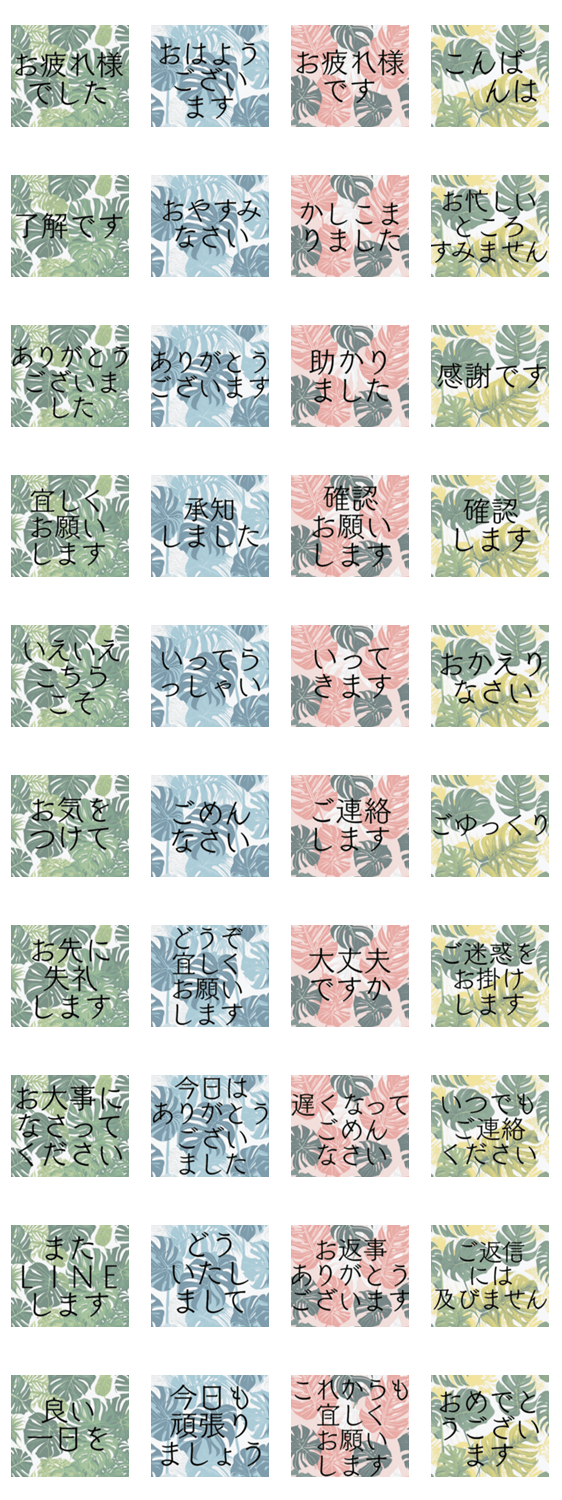 モンステラを背景に日常で使う言葉をのせました。仕事、ビジネス、OL、友達、友人、恋人、家族に。丁寧語。おしゃれ、シンプル、パステル、カラフル