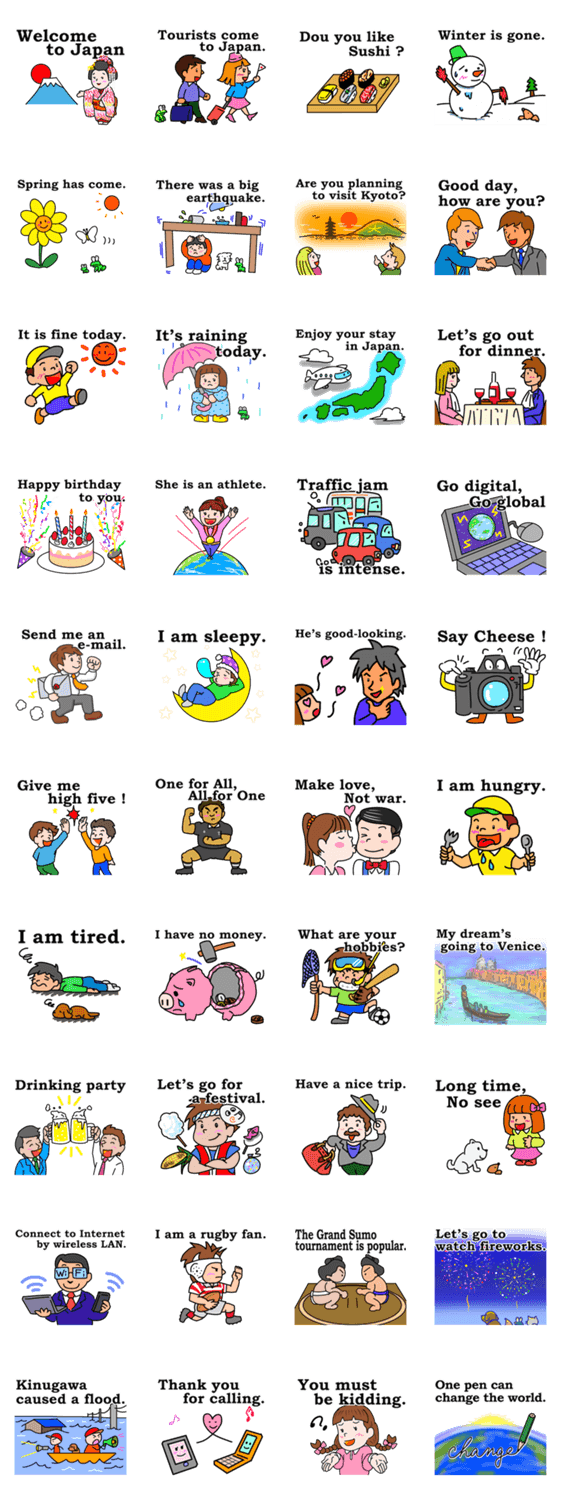 観光立国の 旗印の下、 英会話の機会が増えるものと 予想されます。本スタンプは、基礎的な40の文例を用意しました。生きた英語を学び、会話力を強化しましょう。