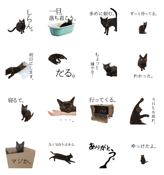 | スタンプ説明 | こんにちは。 ぼくは 黒猫のゆっけ です。 すきなものは かつおぶしです。 |