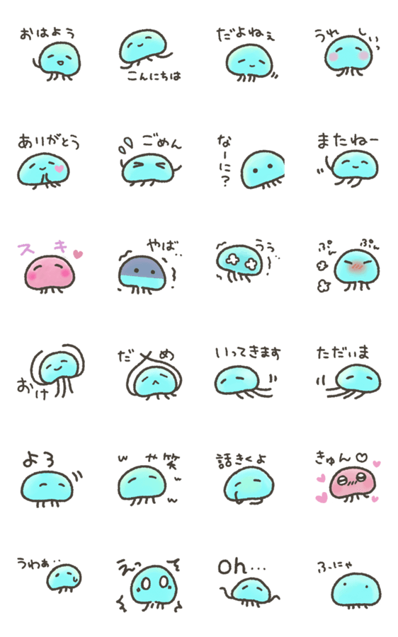 水族館にいるような、ゆらゆらと動くくらげのスタンプです。ほんわかした色合いと、ゆっくりした動きで癒されます。
