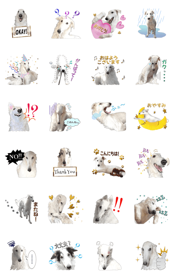 | スタンプ説明 | 大型犬ボルゾイのちょっとおしゃれでちょっと便利なスタンプです。 日常生活を大人可愛く表現しました。 |