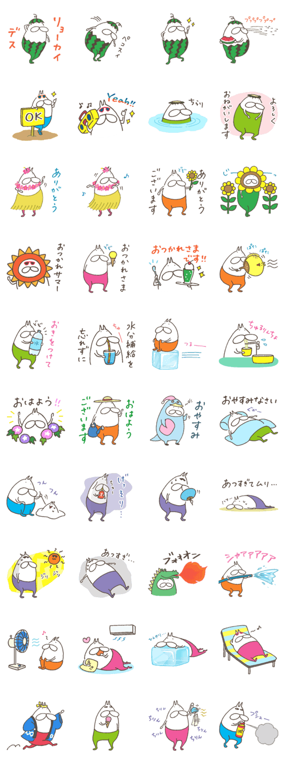 ねこタイツの夏をテーマにしたスタンプです。スイカやひまわり、氷など夏っぽいモチーフでトーク内も夏色に。ねこタイツと一緒に涼みながら暑い夏も乗り越えましょう。