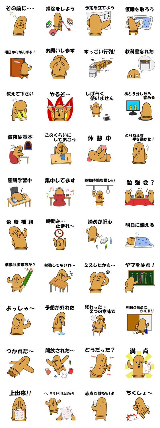 マウスで描いたハニワ(はにわ)がテスト前後の気持ちを表現します。社会人の方も学生の方もこのスタンプを使ってテストを乗り切ろう